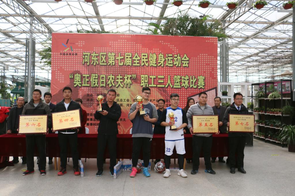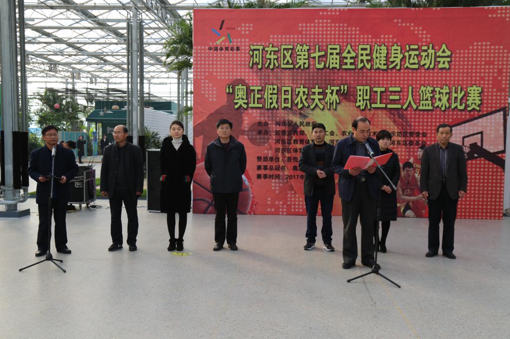 11月25日,河东区第七届全民健身运动会“奥正假日农夫杯”职工三人篮球比赛在河东区奥正假日农夫隆重举行。区体育中心主任杨美成主持,区教体局局长诸葛夫杰致辞,区总工会常务副主席朱建忠宣布比赛开幕。区旅游局、团区委、山东奥正集团等相关部门领导、嘉宾及运动员、裁判员、工作人员200余人参加了开幕式。